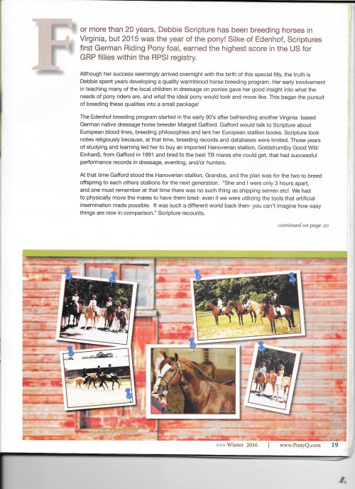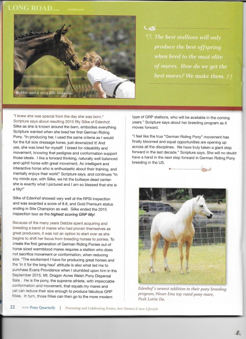 Silke of Edenhof has once again drawn attention to her home! Pony Quarterly interviewed me to find out more about the breeding program that produced the no# 1 RPSI foal of 2015. The fact that she is a German Riding Pony and that her breeding was bought at a Stallion Service Auction also fascinated them. After a lengthy chat with Jane and Audrey, they realized that Edenhof has a long history of warmblood breeding etc… but, they were mostly interested in the pony breeding aspect for their article and why Edenhof was starting to breed GRPs at this time when so many breeders are closing up their farms for good. I explained as best I could that it was a personal project that I had put off for many years. I felt the time was finally right for both personal reasons, and because the American market is finally “ready” to embrace these more suitable mounts for smaller adults and children who want to be taken seriously in dressage, but are overmounted on the typical 16.2+hand warmblood with huge gaits! When you’re the boss, you get to make those choices to pursue new adventures.
