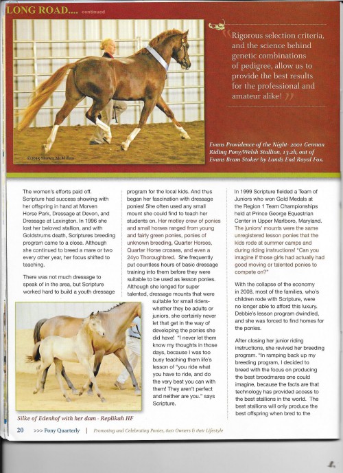 The article was a positive experience in many ways. Initially, as a person who cherishes my privacy and isolation, I feared being portrayed as a “nutty, genetic scientist”. However, this was not the case at all. Actually, I thought more attention could have been paid to my formal education in equine genetics, breeding management, and breeding experience etc. and less to the years I taught dressage lessons on whatever ponies I could muster up for students to train on. But, it was their article and I assume all that technical stuff I find so important, wouldn’t have made it a good read for their audience, so it was edited out. In retrospect, I think their presentation and interest was in putting together a light historical overview that would interest the average pony person, and they seemed to have successfully accomplished that goal. I am in no way offended although personally, I read for self-education and so I do hope that someone, somewhere, will find something of value in the piece about actual breeding practices and that it may encourage them. I am flattered and very much appreciate the recognition that this article brings to the general public about Edenhof, the keeper of all my passions! Thank you Pony Quarterly!