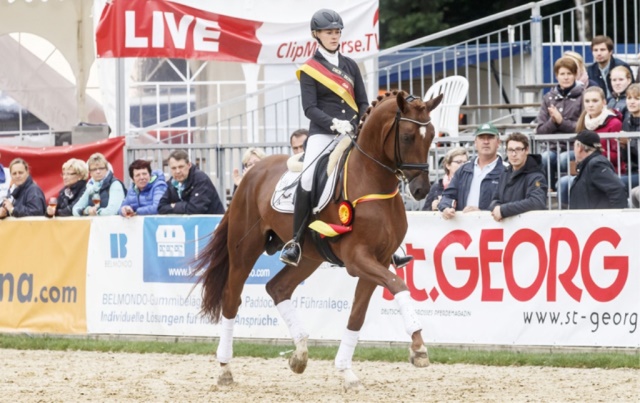 2010 Rheinland stallion bred by Johannes Baumeister, standing at Klosterhof Medinger, liver chestnut, 16.3h. Fürst Fohlenhof was approved as Premium stallion in 2012. As a 3 year old, he bested 15 young stallions and 24 mares and geldings to become the Bundeschampionat of 2013! As the Federal Champion in Germany, he went on to the 30 day stallion test in Newstat/Dosse where he won the dressage index of 8.8 and the rideability index with a perfect 10. He finished as the Reserve Champion of the 2013 30-day Stallion Test with the highest dressage breeding index of 149. In 2014, he again qualified for Germany’s National Championships and was crowned Vice-Bundeschampionat of 2014 in Warendorf. Fürst Fohlenhof excels especially with his movement which was noted by the judges as” being highly elastic and swinging through his entire body, particularly at trot as well as presenting serenity and elegance. This is what our modern dressage horse should be.” https://www.youtube.com/watch?v=Rw-PKpU4dJw